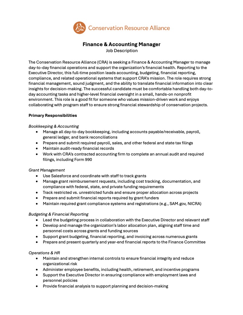 This role is well-suited for a hands-on financial professional who thrives in a dynamic nonprofit environment. The Finance & Accounting Manager works closely with program staff to manage grant funding, maintain audit-ready records, and ensure responsible stewardship of public and private resources. In addition to leading budgeting processes and supporting organizational planning, the position also contributes to internal operations such as benefits administration and financial controls, helping CRA operate efficiently while advancing its mission to restore rivers and habitats.