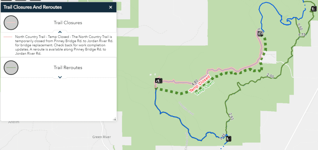 A section of the North Country Trail and Jordan Valley Pathway, from Pinney Bridge Road to Jordan River Road, is temporarily closed for the Jordan River stream-crossing enhancement project