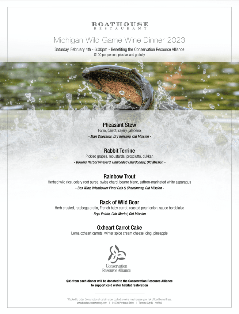 This 5-course meal highlights Michigan wild game with wine pairings from local OMP wineries (menu below). The best part is that this incredible evening is a CRA fundraiser, with ticket proceeds helping support our Cold Water Habitat Restoration. There will be a wonderful silent auction for your bidding pleasure. Be sure to secure tickets ASAP, as this event always sells out.