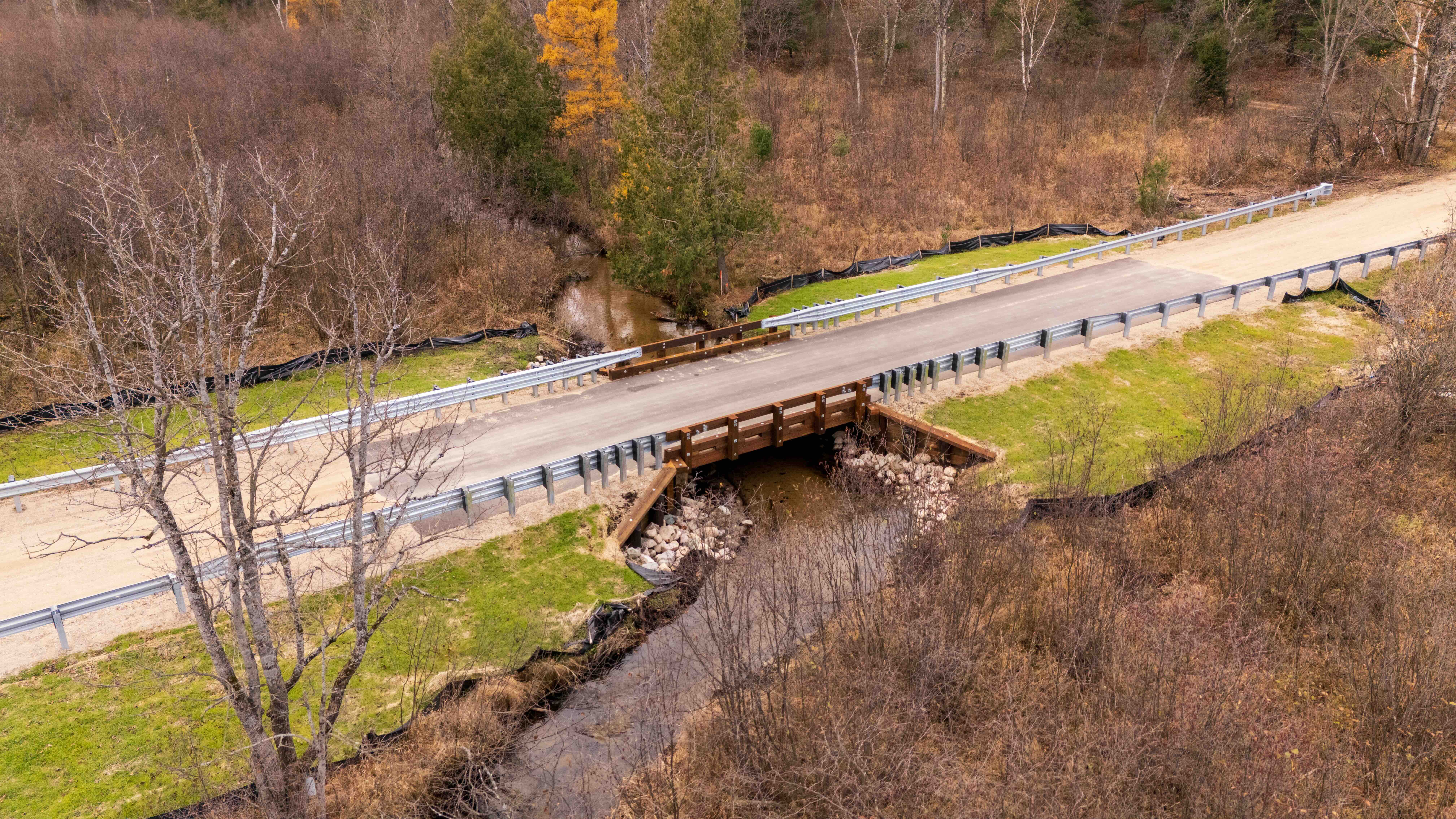 Construction wrapped late last year on a long-standing barrier along North Cole Creek, a cold-water tributary to the Baldwin River in the Pere Marquette watershed. The project replaced three undersized and perched culverts with a channel-spanning timber bridge, restoring the creek’s natural flow and reconnecting more than three miles of high-quality upstream habitat.