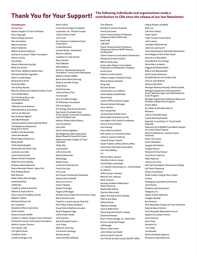 From the rushing waters of northern Michigan’s wild rivers to the quiet strength of its protected forests, thank you for supporting CRA’s mission. Your contributions ripple across the Great Lakes region, safeguarding community treasures. Future generations will have you to thank for healthy watersheds and thriving wildlife.